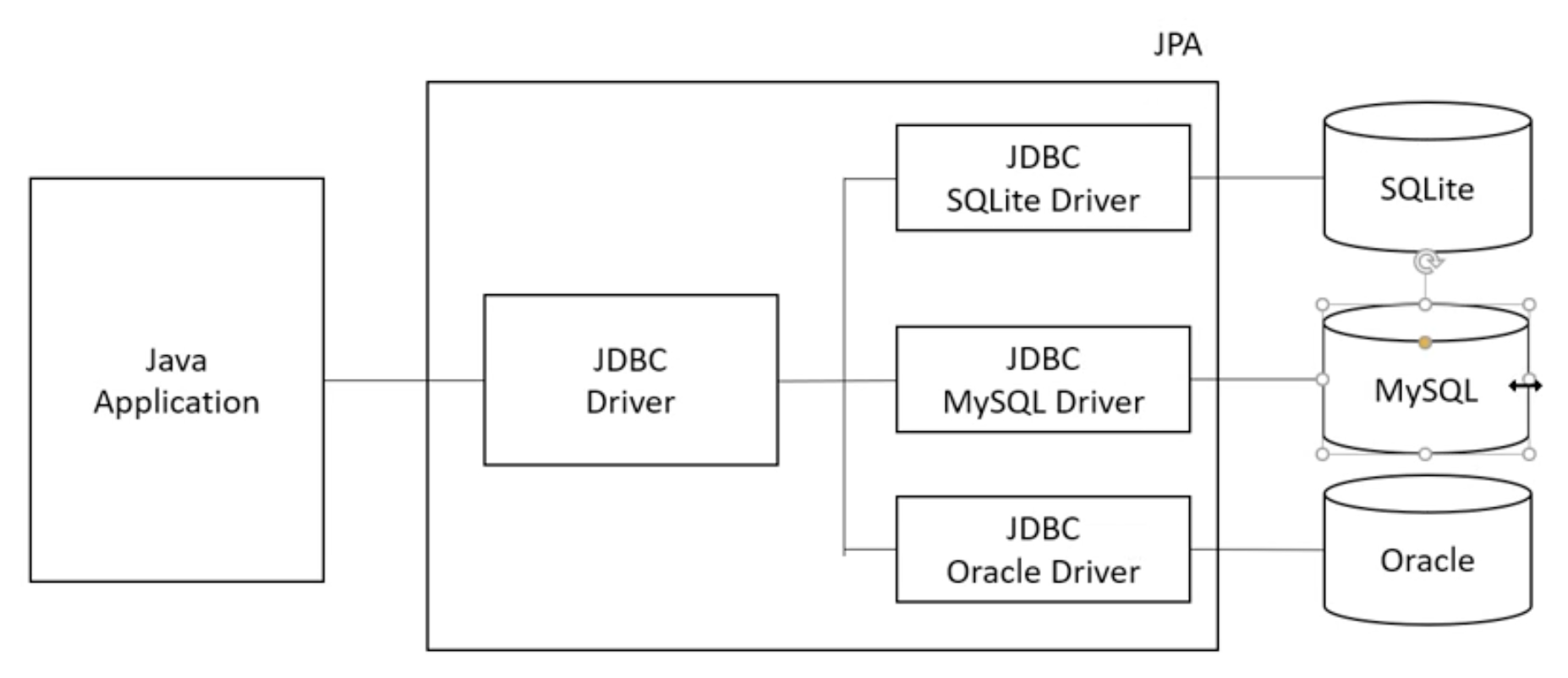 - JPA 도 결국 JDBC 를 사용한다. JPA 가 RDBMS 별로 JDBC Driver 를 제공하므로 어떤 RDBMS 든 자유롭게 사용할 수 있다.